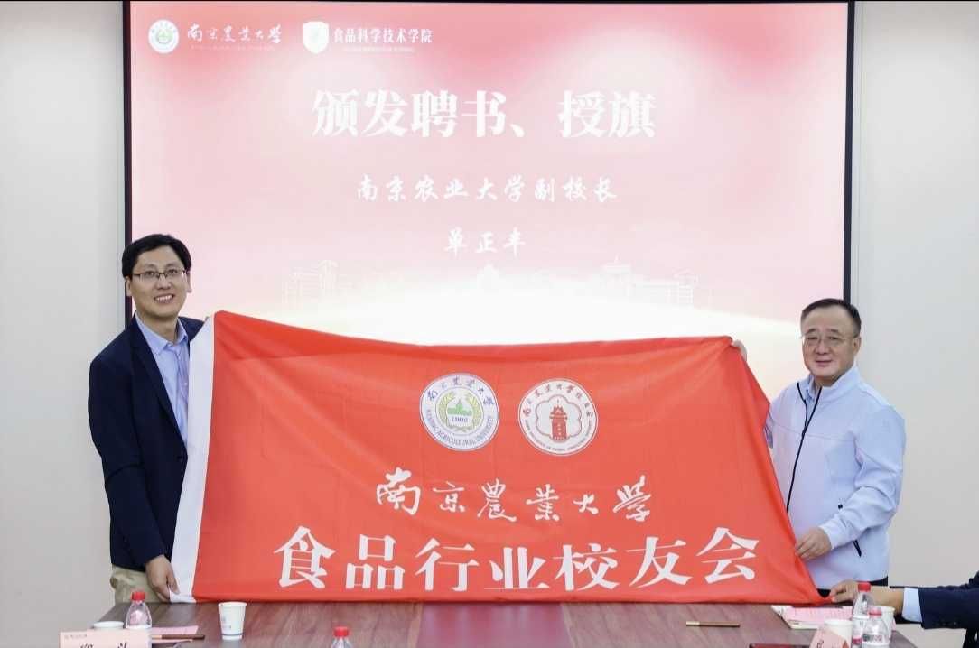 在庄重的音乐声中,南京农业大学副校长单正丰为第二届理事会会长、副会长颁发聘书,并举行了隆重的授旗仪式。鲜红的会旗象征着使命的传递与责任的延续,标志着食品行业校友会正式开启新的征程。