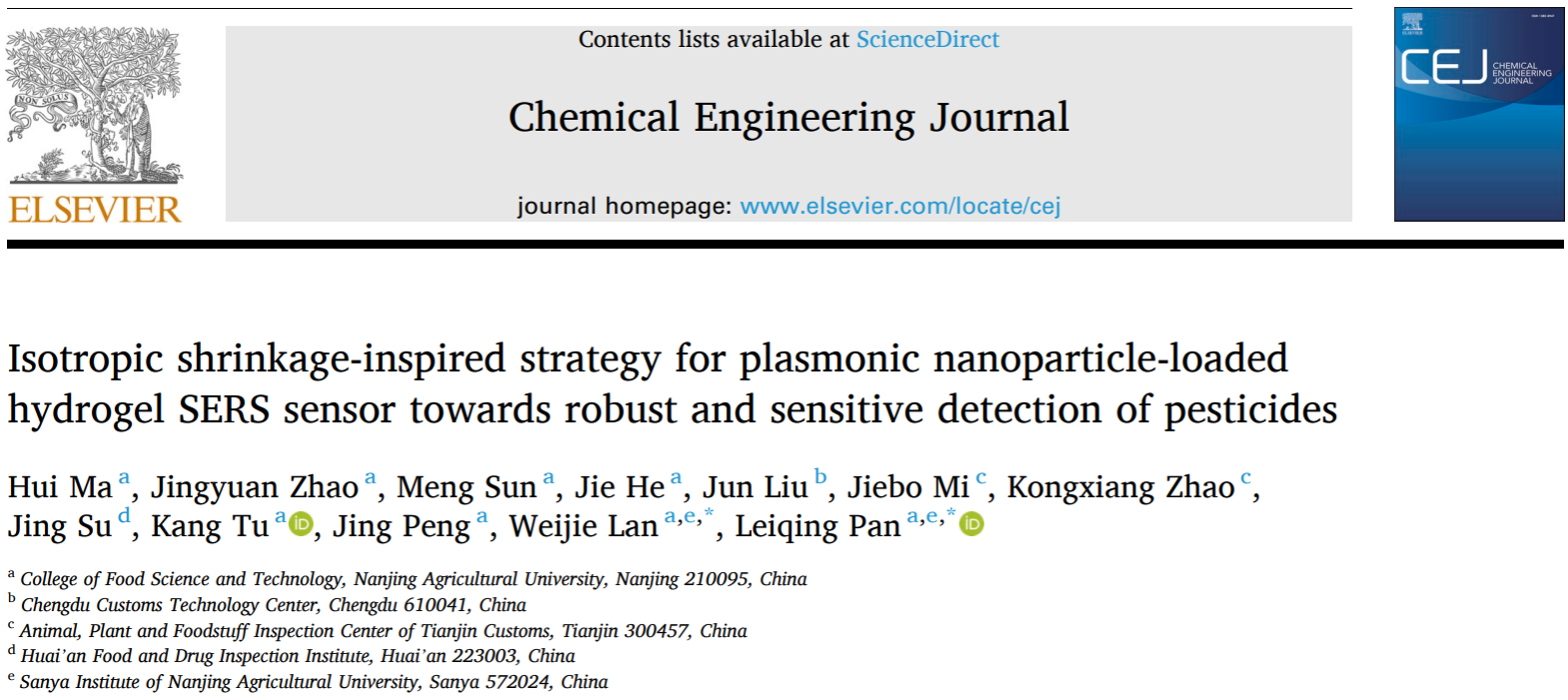 近日,我校bat365正版唯一官网屠康教授和潘磊庆教授团队,利用水凝胶体系中“乙醇-水”快速置换促使柔性表面增强拉曼光谱(SERS)基底“热点”致密化,实现了快速、灵敏、多场景的农药残留分析。相关研究成果以“Isotropic shrinkage-inspired strategy for plasmonic nanoparticle-loaded hydrogel SERS sensor towards robust and sensitive detection of pesticides”为题,在国际著名期刊《Chemical Engineering Journal》在线发表。