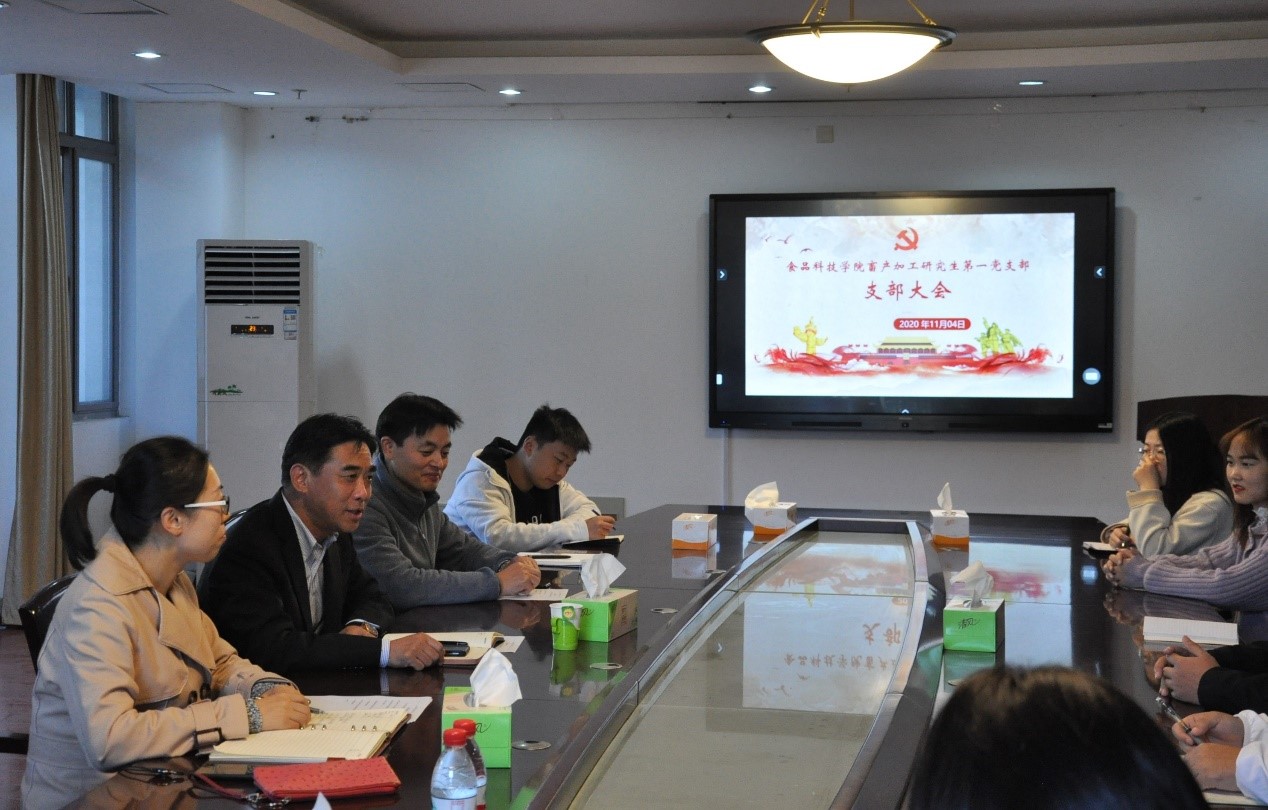 11月4日下午,bat365正版唯一官网畜产研究生第一党支部在国家肉品中心二楼会议室召开党支部会议。南京农业大学资产经营公司总经理许泉,bat365正版唯一官网副院长李春保,及畜产研究生第一支部全体党员30余人参会。会议由李春保主持,